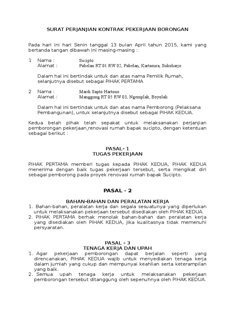 Top Pdf Surat Perjanjian Pemborongan from data03.123dok.com Contoh surat perjanjian borongan : Contoh permohonan pengunduran diri kerja karyawan kontrak. Ketika membuat dokumen surat perjanjian dibutuhkan contoh yang baik dan benar, agar surat perjanjian tersebut sah dan resmi dimata hukum. Contoh laporan proyek konstruksi baik laporan harian,mingguan,bulanan dan akhir proyek. Pembuatan surat kontrak kerja proyek ternyata tak begitu sulit. Contoh surat perjanjian kerja sama, jual beli tanah, kontrak dan sewa rumah, serta utang piutang yang bisa dijadikan referensi. Perjanjian tersebut berisi tentang syarat, hak dan kewajiban satu sama lain. Berikut contoh surat kontrak kerja rangkuman jurnal manajemen yang dapat dijadikan referensi bagi para pengusaha maupun calon karyawan yang akan memulai sebuah karir :